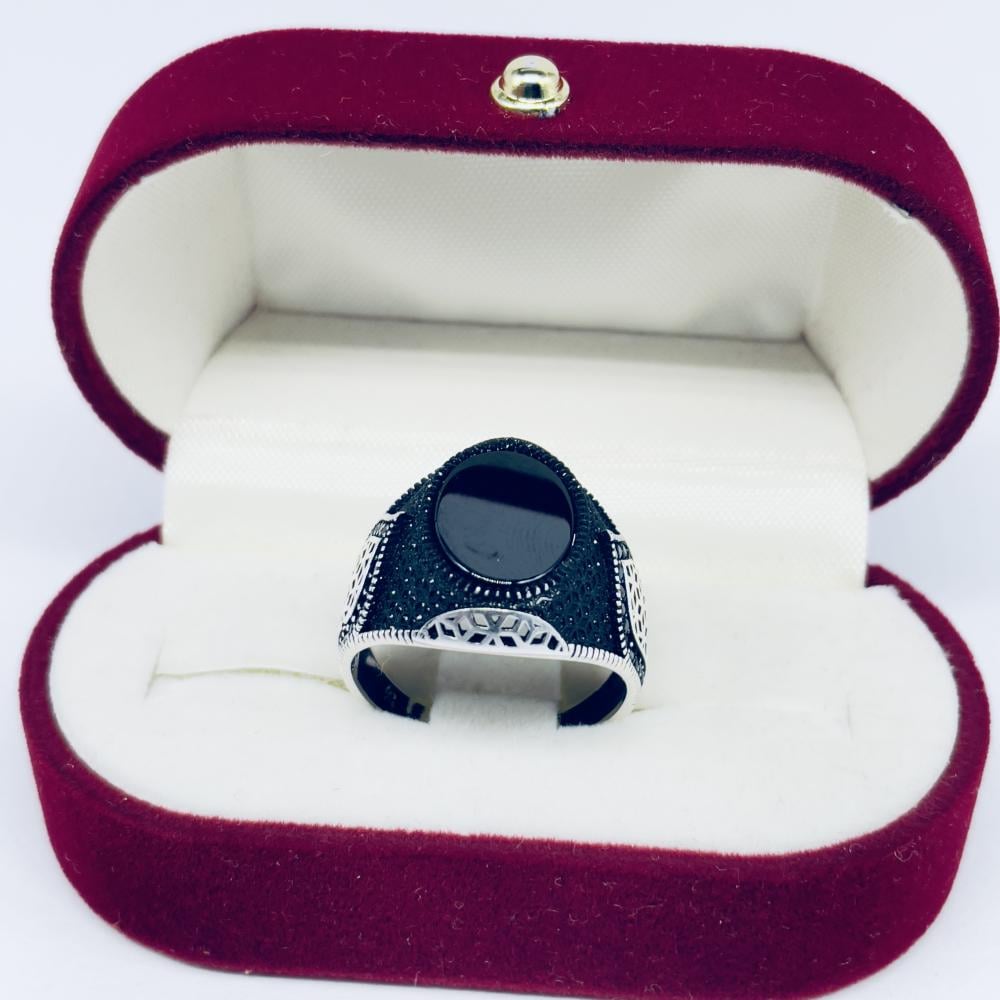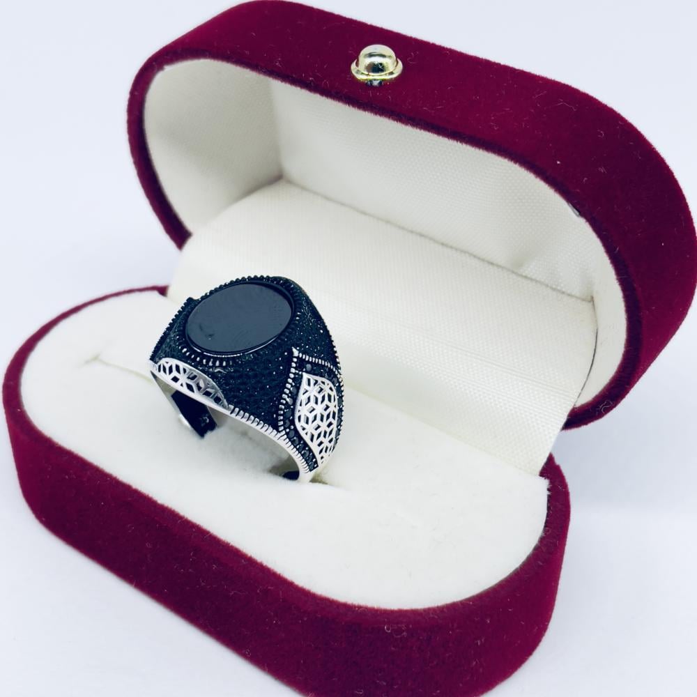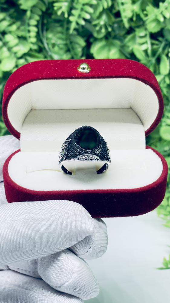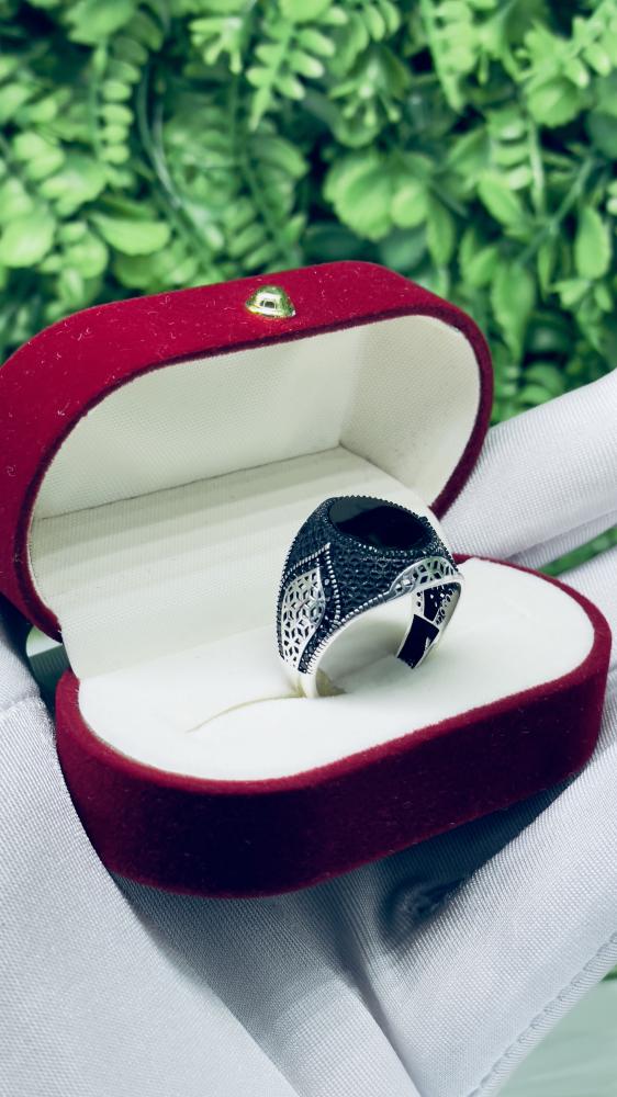 خاتم راقي يتميز بتصميم مميز حيث أن في قلب التصميم يبرز حجر أونكس أسود مصقول بشكل مستطيل بزوايا دائرية ناعمة، محاط بإطار فضي مزخرف بتفاصيل دقيقة تشبه الحبال المجدولة، مما يعطيه طابعًا قويًا مع جوانب مزينة بنقوش هندسية ونقاط سوداء صغيرة، ما يجعل هذا الخاتم تحفة فنية من الإبداع الشرقي.