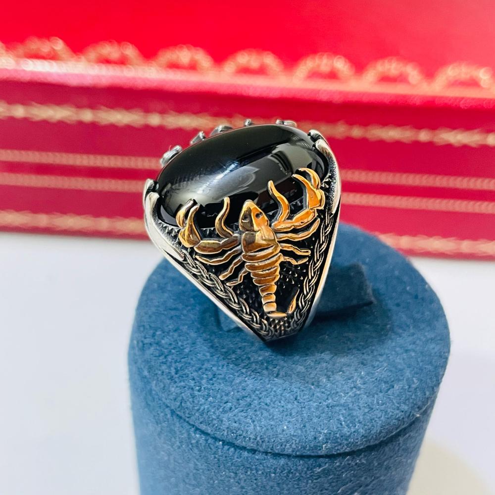 خاتم فضة ملكي عيار 925، مصنوع بعناية فائقة، يحمل تفاصيل دقيقة ويبرز بفص الأونكس الأسود اللامع مع نقش عقرب فخم.
