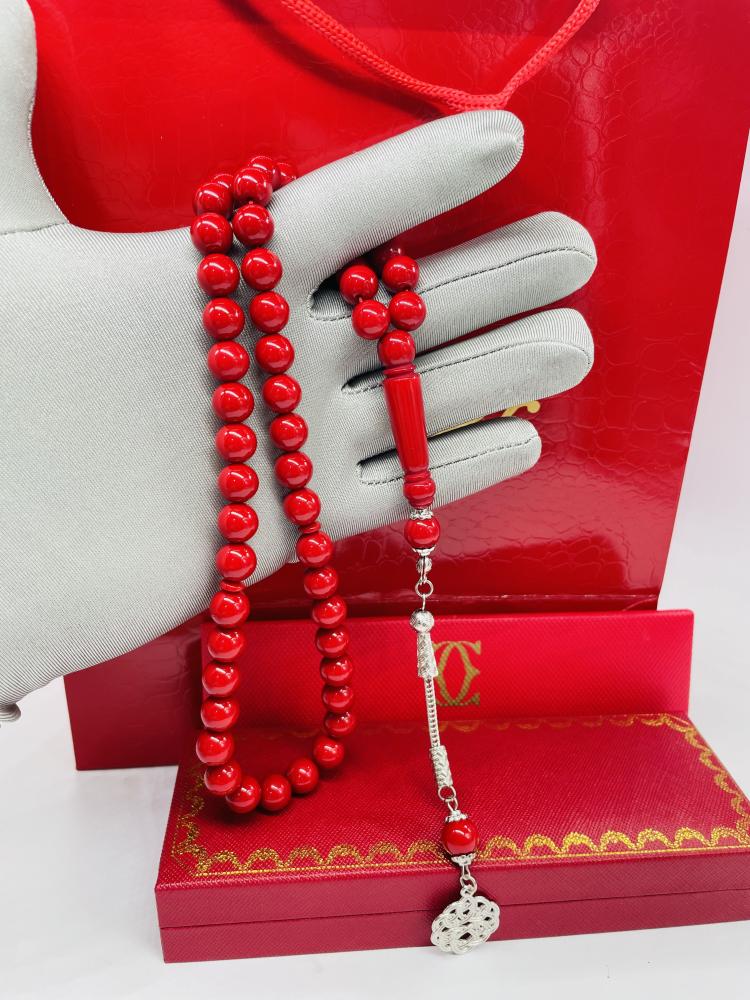 • لون لافت: اللون الأحمر الصريح للحبات يعطي المسباح مظهر حيوي ومتميز، ويبرز جماله عند الإمساك به.
